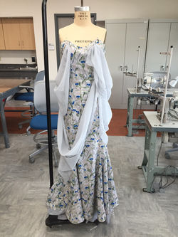 To start out the process, I began draping the muslin onto the mannequin. Once recieving my model a lot of adjustments were required in regards to the size difference from my model to mannequin. After taking in the muslin and making the same adjustments onto my pattern as well, I then assembled the dress and fitted my model again. Once properly fitted, I played around with how the chiffon would drape. Seeing how it would lay, I decided to change my original design as to not cover as much of the dress. I established the layout of chiffon blind stitched the hem of the draped chiffon and sewed it into the princess seams of the dress and pressed them into place.